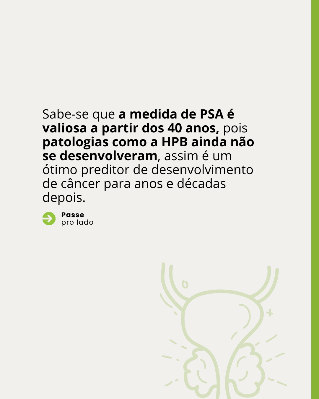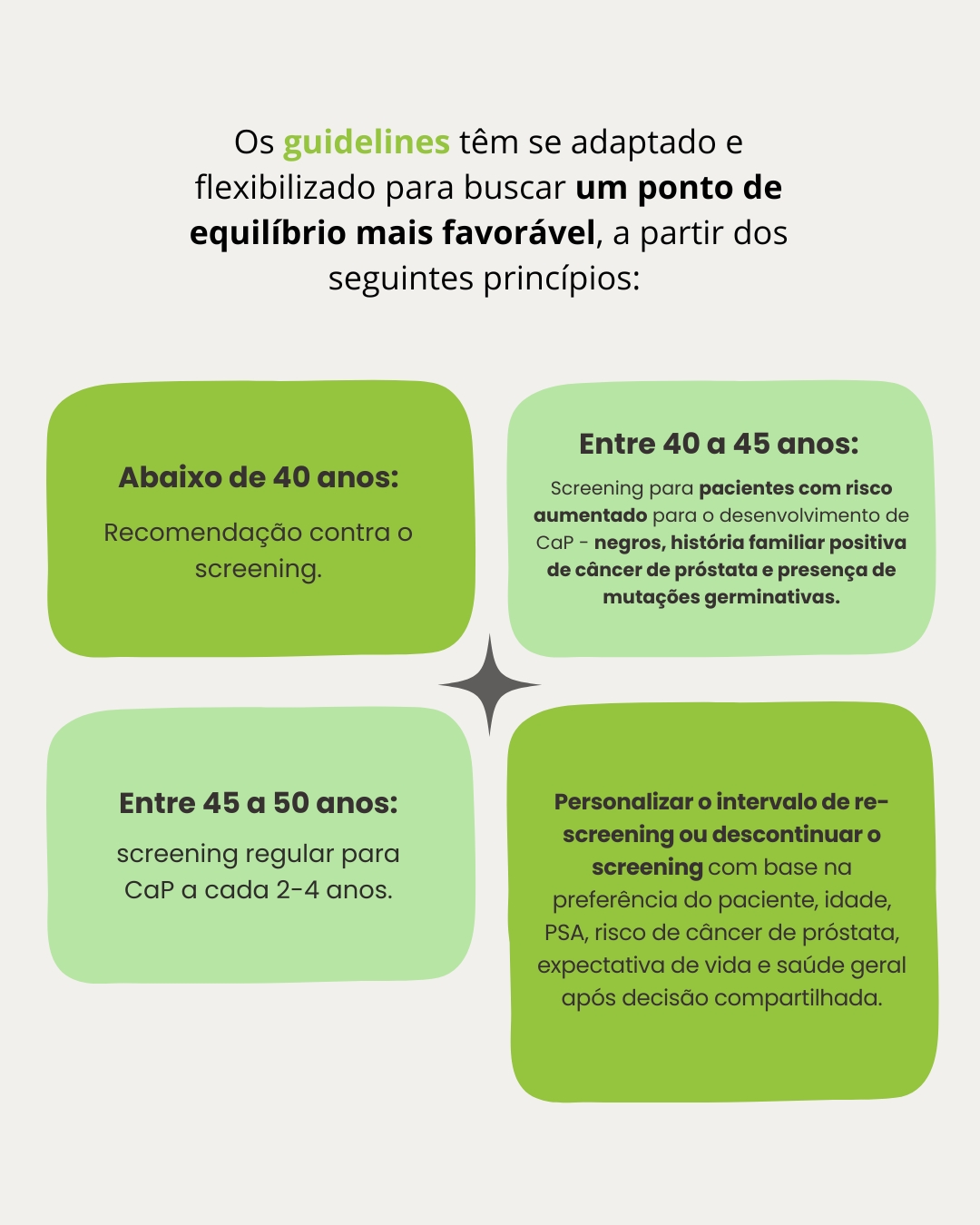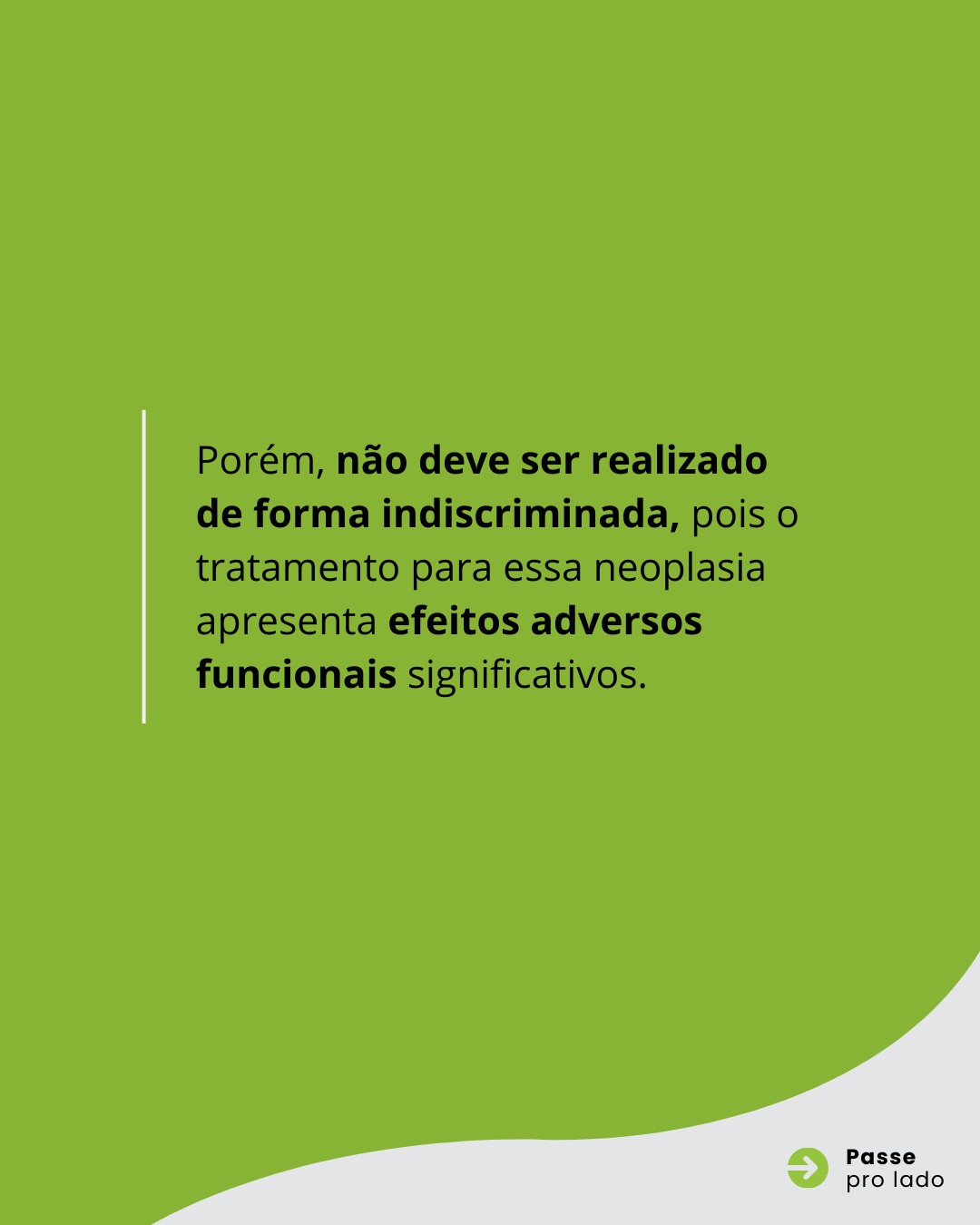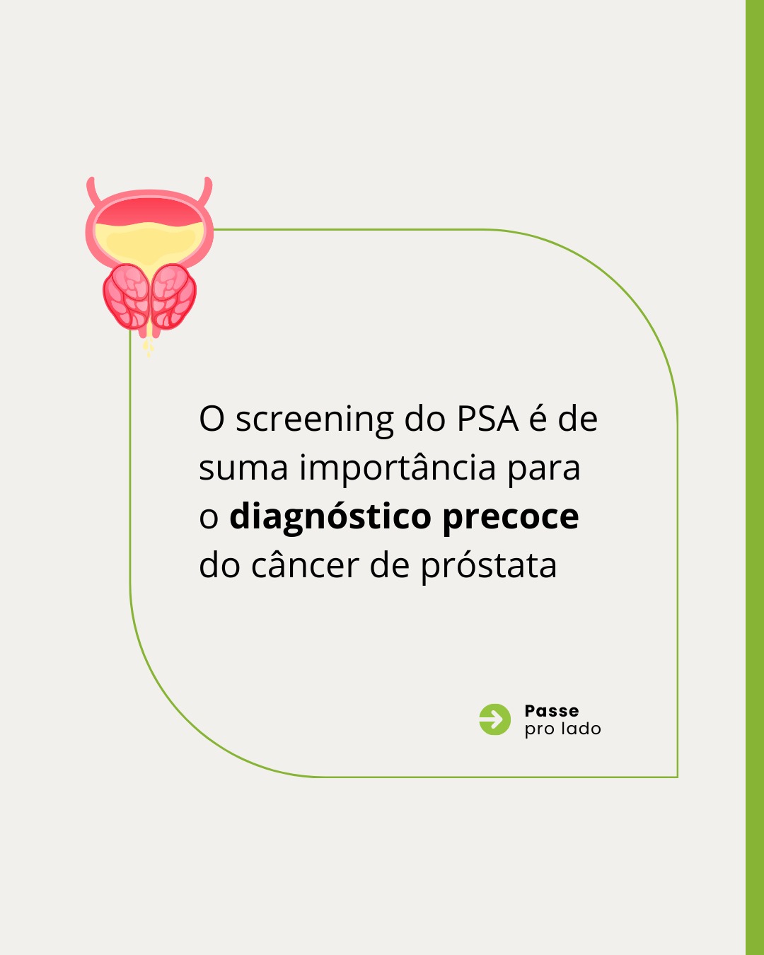 O screening do PSA é de suma importância para o diagnóstico precoce do câncer de próstata. Porém, não deve ser realizado de forma indiscriminada, pois o tratamento para essa neoplasia apresenta efeitos adversos funcionais significativos.