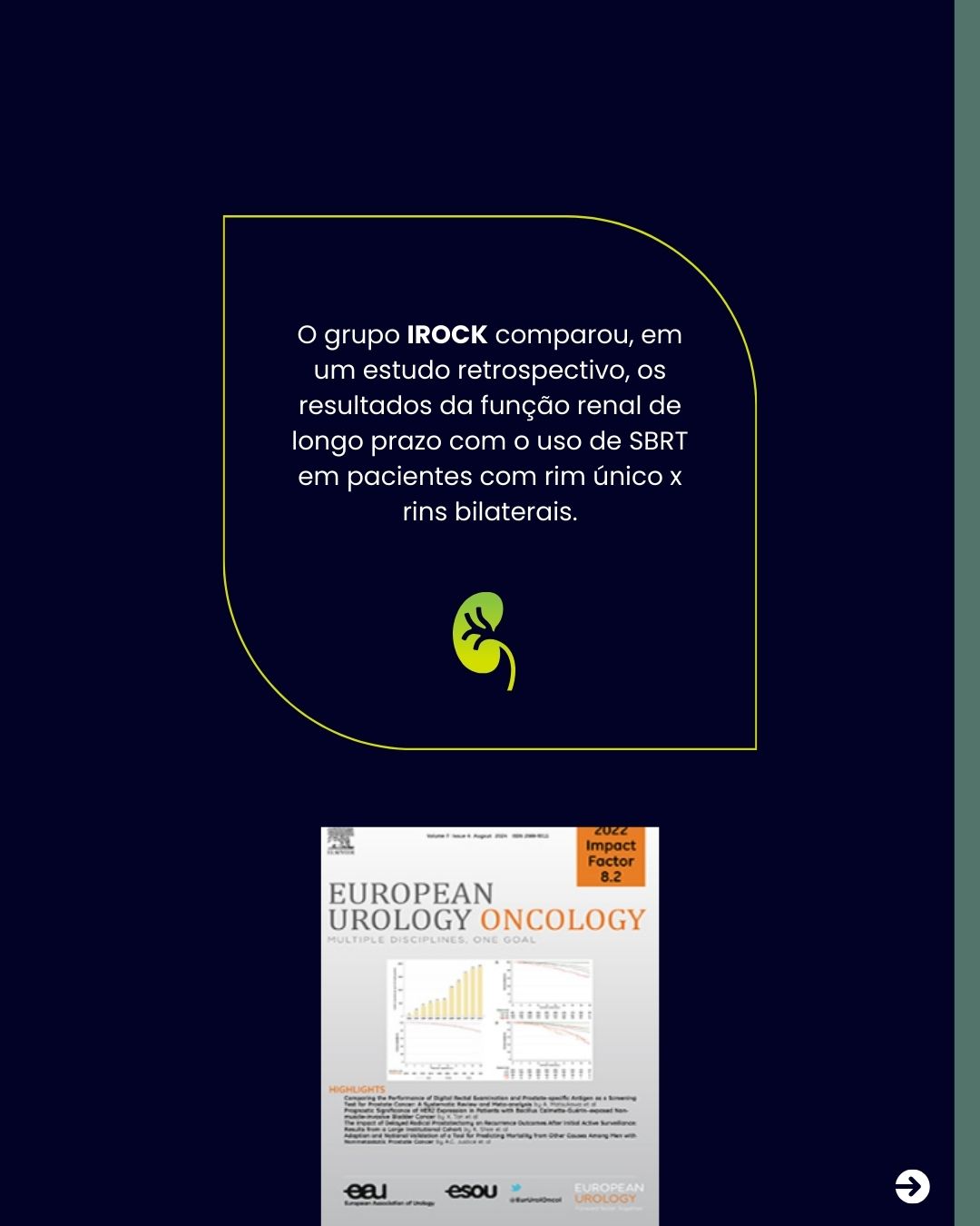 O International Radiosurgery Consortium of the Kidney (IROCK) já publicou anteriormente os resultados clínicos pós SBRT para câncer renal. O objetivo deste trabalho foi comparar os resultados da função renal de longo prazo com SBRT, do banco de dados IROCK, em pacientes com rim único x rins bilaterais.