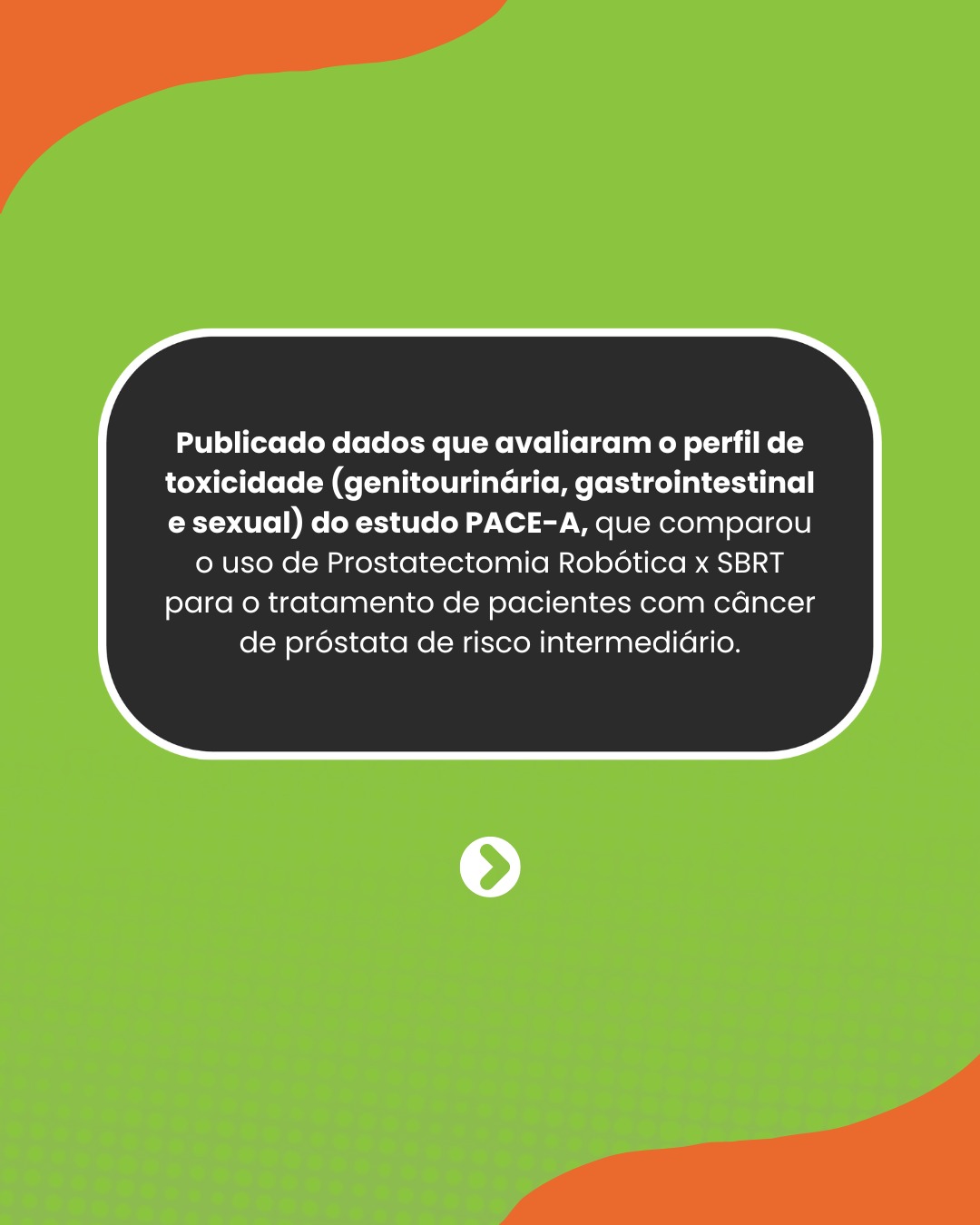 Atualmente, técnicas avançadas como a PTR Robótica 🤖 e SBRT oferecem mais precisão e eficácia no tratamento 🔬. O estudo PACE-A avaliou a qualidade de vida comparando PTR Robótica e SBRT. Foi um estudo de fase 3, incluindo 123 pacientes 👨🔬 com câncer de próstata de risco baixo a intermediário (T1c-T2c, NO-X, MO-X), Gleason ≤ 3+4 e PSA ≤ 20 ng/ml.
